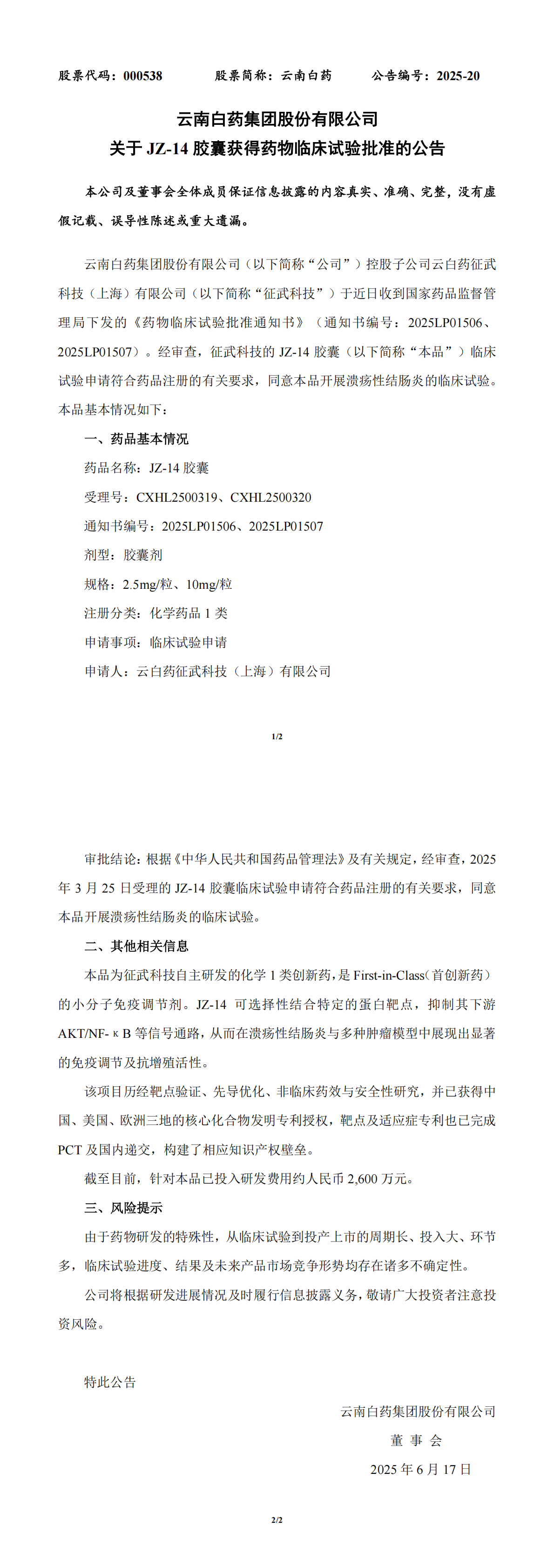 j9九游会官网集团股份有限公司 关于 JZ-14 胶囊获得药物临床试验批准的公告